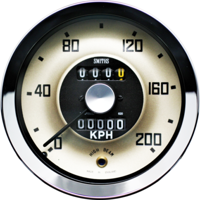 100mm diameter Austin Healey 3000 Speedometer with gold dial, black print and half V chrome bezel. with strap fixing, floodlit illumination and high beam warning light. Available in KMH and MPH scale.