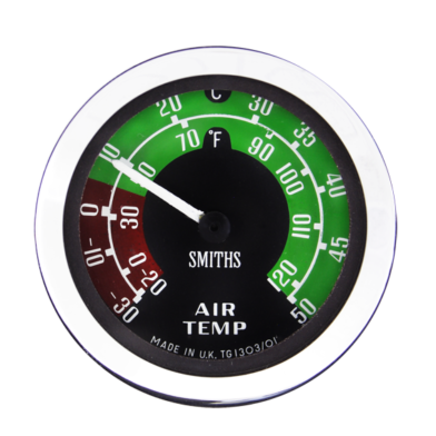 This Ambient temperature gauge is an electronic version of the gauge once fitted as an ‘extra’ to many Classic Cars. It features the classic red and green sectors on a classic black dial, 1/2 vee chrome bezel and comes complete with a PT sensor and 3.5metres of cable. Available in 2 scales. Also available with a black bezel.