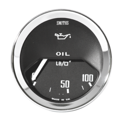 Oil pressure gauge 0-100psi with black dial, white print and chrome bezel. Available in 1/2 V bezel or IVA