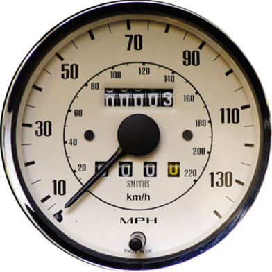140 MPH Mechanical Stepper Speedometer with magnolia face, black print, black pointer, chrome bezel and the SMITHS logo. Available with full V chrome bezel or IVA and in MPH or KMH variant.