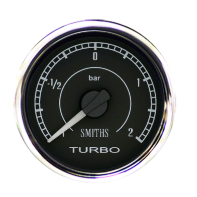 Smiths 52mm classic flight turbo boost gauge -1 to +2 Bar. Half round chrome bezel as standard. White pointer, print and plastic case. 0-5volts sender