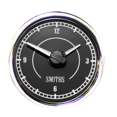 52mm SMITHS Classic Flight analogue clock with black dial and 1/2 round chrome bezel. Tailed pointer and white print.