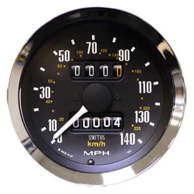Smiths Classic 80mm dashboard fit mechanical speedometer. Black dial, white print and pointer. Features mileage counter and floodlit illumination.