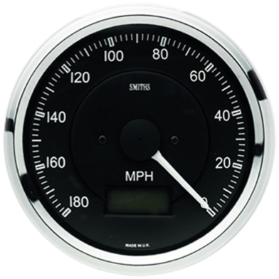 Smiths Cobra 100mm (4in) digital programmable speedometer with black dial, chrome bezel, white print and white pointer. 12v remote reset and 3 watt bulb. Available in clockwise and anti-clockwise, MPH and KMH