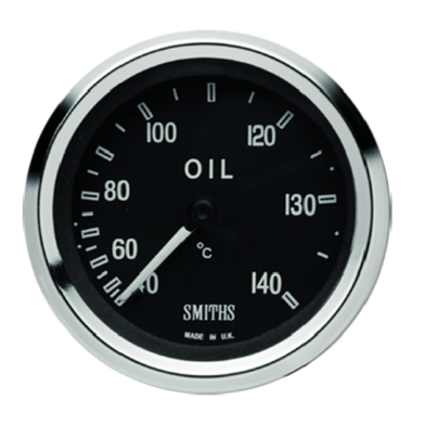 Cobra 52mm electronic oil temperature gauge with SMITHS logo. 270° sweep, 40-140°C Floodlit illumination. Available in full v or 1/2 round chrome bezel.