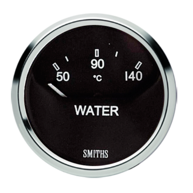Cobra 52mm electronic water temperature gauge with SMITHS logo. 70° sweep, 50-140°C Floodlit illumination. Available in full v or 1/2 round chrome bezel.