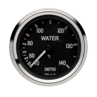 Smiths Classic mechanical 52mm water temperature gauge. 140°C 7/8 inch capillary. Black dial, white print and pointer. Available in full v or 1/2 round chrome bezel.