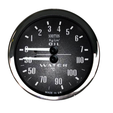 52mm dual gauge with black dial and white print. Half V chrome or black bezel. 7kgm 30-110°C