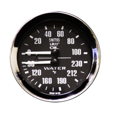 52mm dual oil and water with black dial and white print. 90-230°F 0-100psi. With K type bulb.