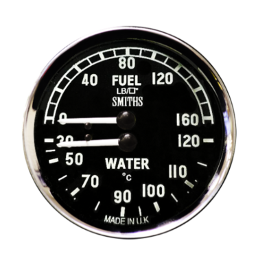 52mm dual fuel pressure and water temp gauge with black dial, white print and full v chrome bezel. 0-160psi, 30-120°C. K type bulb. Slot illumination. Please click here to view details on our dual gauge bulb types