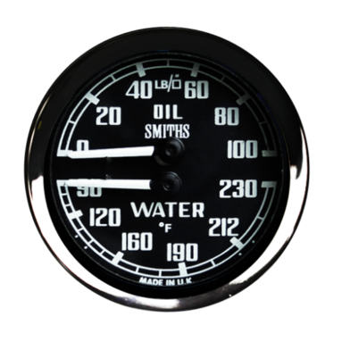 52mm dual oil pressure and water temperature gauge with black dial and half V chrome bezel. 0-100psi, 90-230°F