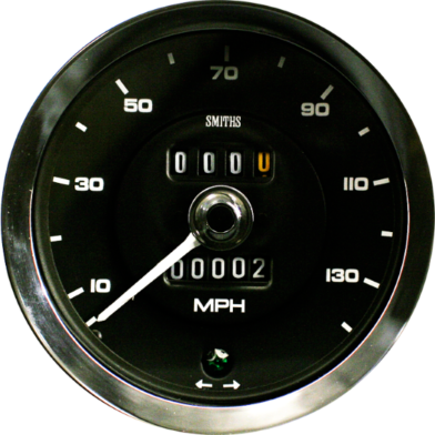 Lotus Elan Series 4 140 MPH Speedometer. 100mm diameter half vee chrome bezel and remote reset. Single green warning light, Lotus font. 980TPM