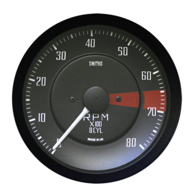Smiths Classic digital 100mm tachometer for the GT40, easy setup allows for engines up to 12 cylinders. 1/2 V black bezel, black dial and white print. Red sector at 6.5 – 7k. 12volt, 3 watt bulb.
