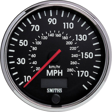 With black dial, white print, chrome full ‘V’ bezel and red pointer. Available in MPH and KMH scale.