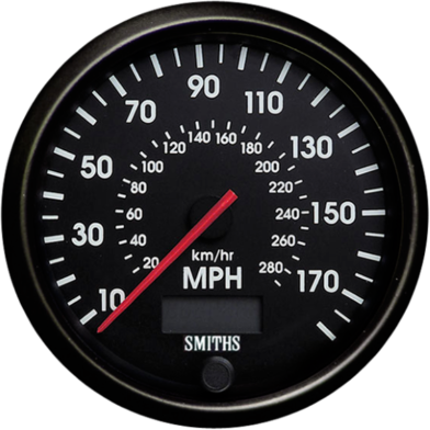 With black dial, white print, black full ‘V’ bezel and red pointer. Available in MPH and KMH scale.