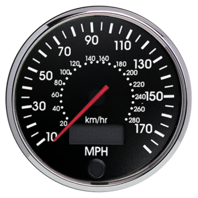 With black dial, white print, chrome full ‘V’ bezel and red pointer. Available in MPH and KMH scale.