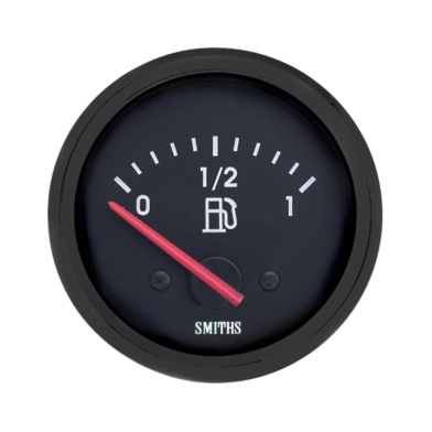 52mm Fuel gauge with black dial, white print, red pointer and black full ‘V’ bezel.