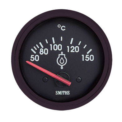 52mm oil temperature gauge with black dial, white print, red pointer and black full ‘V’ bezel. 12Volt