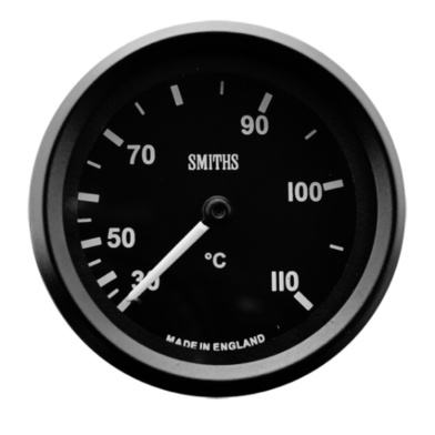 52mm Water Temperature Gauge with black dial and and full vee black bezel. Beige print and pointer. Strap fixing. Supplied with A2 type bulb.