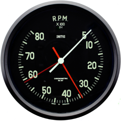 Re-designed from original SMITHS archives in aged white print, black dial with twin contrasting aged white and red pointers. Applied with modern technologies, the now electronic Tachometer complete with built in speed sensor is set in a 120mm black machined billet case and powder coated black full vee bezel. The SMITHS Logo and original SMITHS product number is also printed on the dial.