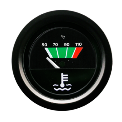 52mm waterproof water temperature indicator 50-110°C with black shrouded dial, white and green print. 24volt. Earth Return.