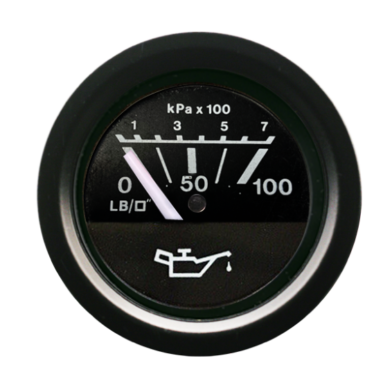 52mm waterproof air-cored oil pressure indicator 12 volt. 0-100lb/sq.in. 0-7KPC x 100. Black dial with white print, black flat bezel, and green internal illumination.