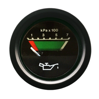 52mm waterproof oil pressure indicator with black dial, green white and red print and green internal illumination. 0-7 kpa X 100. 24 volt. Strap fixing. Earth return
