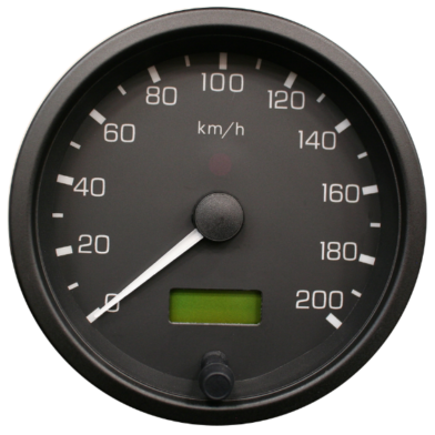 100mm Speedometer with black dial and black flat bezel. Green illumination. Available in MPH or KMH scale