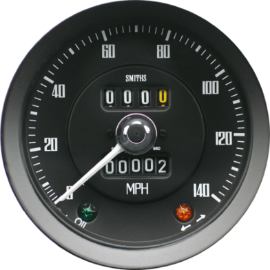 100mm remote trip nemag speedometer 0-140MPH. S.A.E. connection. 960revs. Black dial, white print, white pointer. 1/2 V black bezel. Floodlit illumination. SMITHS logo. Oil and indicator warning lights.