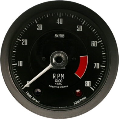 Lotus Elan Mk 1 100mm Tachometer with black dial, white print and white pointer blade. Half vee black bezel. ‘Positive Earth’ – Will operate on both positive and negative earth systems. Warning Lights include High Beam and Ignition