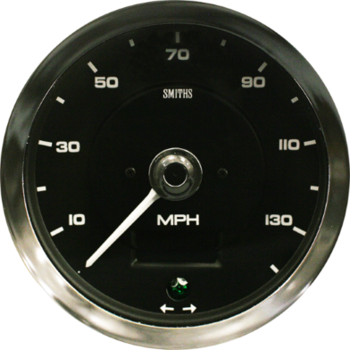 Lotus Elan Mark 2 140MPH 100mm Speedometer. Electronic movement, remote reset. Pointer with Chrome embellishment. Black dial white print, Lotus font.