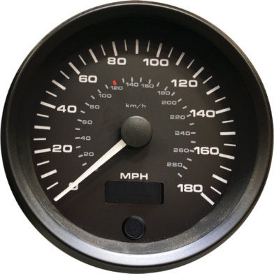 100mm diameter speedometer with black dial white print and black full v bezel. Red illumination. Available in 0-180MPH or 0-300KMH