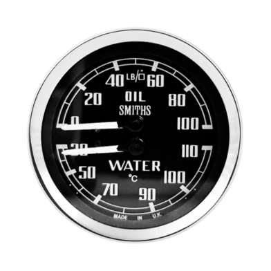 52mm dual water temperature and oil pressure gauge with SMITHS Logo. Chrome half V bezel, black dial and white print. Oil pressure 0-100psi, water temperature scale 90-230°F or 30-110°C. A2 type bulb