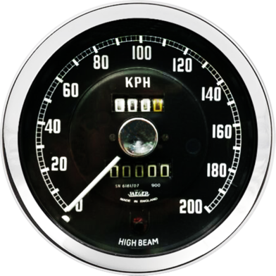 100mm (4in) 0-200KMH mechanical speedometer for the MGA with half V chrome bezel,l black dial, white print, moulded white pointer with pure aluminium centre. Remote trip, clockwise rotation, strap fixing, flood lit illumination and high beam warning light. 900Revs