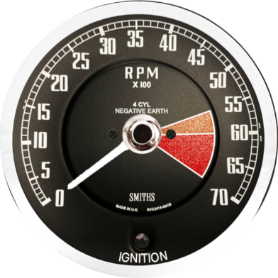 100mm MGB Digital Tachometer 0-7000RPM with black dial white print white pointer and chrome half ‘V’ bezel. Ignition Warning light and Orange / Red sectors to scale.12V negative earth. Red LED and and flying leads