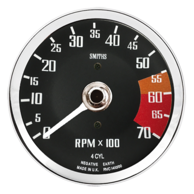 80mm Tachometer 0-7000RPM with black dial, white print, white pointer and half ‘V’ chrome bezel. 12V negative earth. 4 Cylinders. Floodlit illumination.