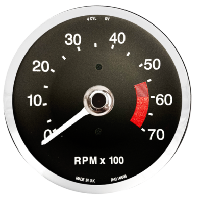 80mm digital 0-7000RPM Tachometer with black dial, white print, white pointer and chrome half ‘V’ bezel. 12V negative earth, 4 cylinders and floodlit illumination.