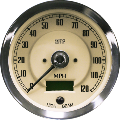 100mm Electronic Remote Trip Speedometer. Available in Black or Magnolia dial with half ‘V’ chrome bezel. Floodlit dial with SMITHS logo and High Beam Warning Light. Scale KMH or MPH