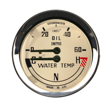 52mm Magnolia dual Oil Pressure and Water Temperature gauge with white illumination. Scale 0-60psi, CNH, Full ‘V’ chrome bezel, Black print, and black pointers. Strap fixing 1/8″ gas pip end and K Type Bulb