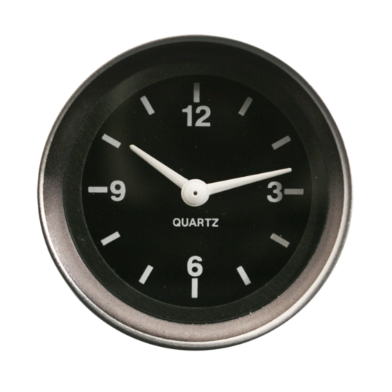 Analogue clock, 52mm sandblasted chrome and inner black bezel, black dial, white minute and hour pointers. Quartz logo. Available in black or magnolia dial with full V or half V bezel.