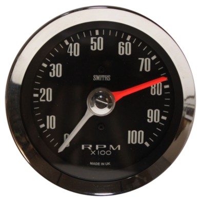 Smiths Mini Cooper / Cooper S 80mm ‘Max Hand’ programmable Tachometer with SMITHS logo, white pointer and red/orange hand. Available in magnolia or black dial with Full or 1/2 V bezel. Linear scale.