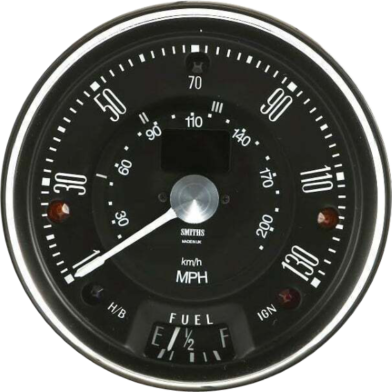 Smiths Mini Cooper Speedometer. Electric Full Sweep, 130mm 12 volt dial with floodlit illumination and chrome bezel. Digital display featuring total mileage and trip mileage (resettable). LED H/B and IGN warning Lights. Available in Black, magnolia or White dial, and in MPH or Km/h range.