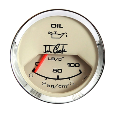 52mm Mechanical link gauge. Available in magnolia dial with 1/2 ‘V’ chrome bezel or ivory dial with full ‘V’ chrome bezel. 0-100 psi with John Cooper Signature and oil can symbol on shroud,1/8 gas pipe connection at rear.