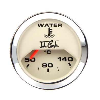 52mm 12 Volt air cored gauge with magnolia dial and black print. Fire orange pointer and 1/2 ‘V’ chrome bezel. Plastic Case. 50-140°C with John Cooper Signature and temp symbol on shroud.