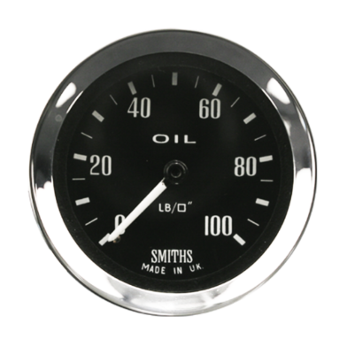 Smiths 52mm mechanical oil temperature gauge. 100psi. Available in black dial with 1/2 ‘V’ chrome bezel or magnolia dial with full ‘V’ chrome bezel.