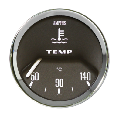 Smiths Classic 52mm electrical water temperature gauge. 50 -140°C. Available in black dial with  1/2 ‘V’ chrome bezel or magnoia dial with full ‘V’ chrome bezel. White internal illumination .Anti clockwise, blade connection and fixing strap