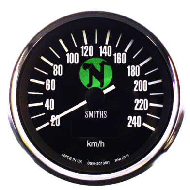 Smiths Classic 82mm (3in) N-green-dot logo Speedometer with waterproof billet case, odo or trip readout and onboard “drive-to-set” programming. Will fit original Smiths mounting brackets. Available in MPH and KM/h variant.