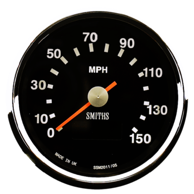 Smiths Classic black face 82mm (3in) Speedometer with odo or trip readout and onboard “drive-to-set” programming. Will fit original Smiths mounting brackets. Features our new billet case and is waterproof to IP 67. Available in MPH and KMH Scales