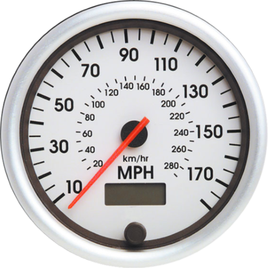Smiths Telemetrix 180mph speedometer with half round anodised aluminium bezel, cirrus white dial, black print and red pointer. LCD display with front reset showing trip or total. 12V. Available in MPH or KMH