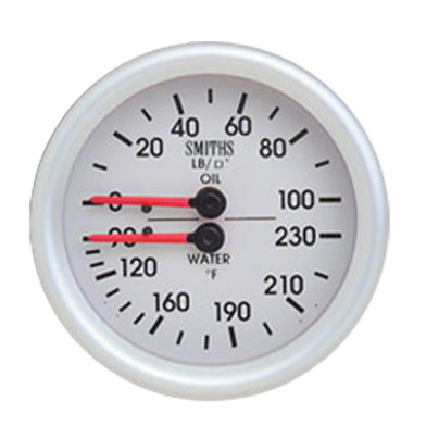 52mm oil pressure and water temperature gauge with cirrus white dial, black print, red pointers and aluminium bezel.